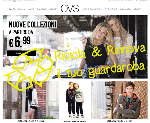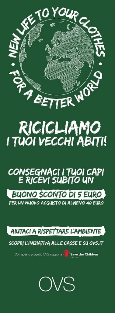 A partire da domani 28 agosto, fino al 31 dicembre infatti, a tutti i clienti che aderiranno al programma di riciclo e consegneranno una borsa di indumenti usati in uno dei negozi OVS aderenti all’iniziativa, verrà dato in cambio un buono sconto del valore di 5 Euro da utilizzare per l’acquisto di capi delle nuove collezioni. Saranno accettati indumenti uomo donna e bambino di ogni marca e in ogni stato, ad eccezione dell’intimo e delle calzature. I capi consegnati, in collaborazione con I:CO, verranno sottoposti ad un’accurata cernita e ad una ulteriore lavorazione e in base al loro stato verranno riproposti sul mercato come abiti di seconda mano o saranno trasformati in prodotti diversi.